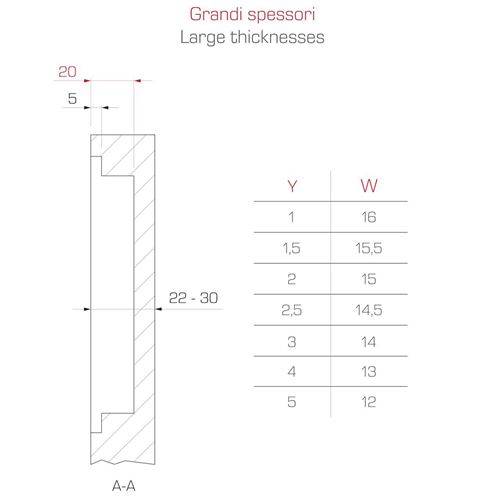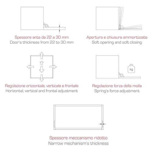 Per ante con spessore da 22 a 30 mm. La posizione dell’anta è regolabile nelle tre dimensioni. Apertura e chiusura ottimizzabili grazie alla regolazione della forza della molla.