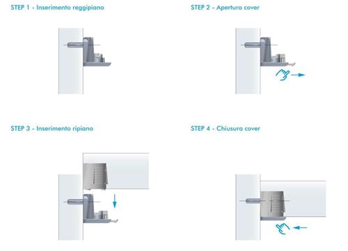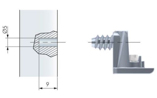 Staffe portaripiani Kalipso con vite euro premontataDispositivo antisganciamento che impedisce il sollevamento del ripiano azionabile senza utensiliRichiede foratura spalla diametro mm. 5x9