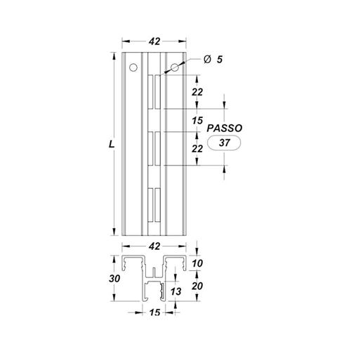 Cremagliera centrale non elettrificata con feritoia doppia.Completa di fori di fissaggio a parete diametro 5 mm.Realizzata in alluminio anodizzato argento.
