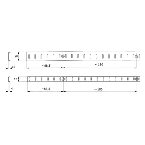 Profili a cremagliera realizzati in lamiera di acciaio piegato utilizzabili per montare ripiani spostabili in mobili vetrina o armadi.