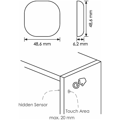 Interruttore a sensore cabalato touch nascosto.Il sensore può essere incollato e permette il funzionamento conspessori fino a 20mm.Funzione ON/OFF e dimmer.Incluso cavo di collegamento da 200cm.