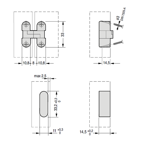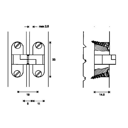 Cerniere invisibili con scodellini in nylon e perni monoblocco in ottone trattato.Fissaggio con viti inclinateApertura 180°