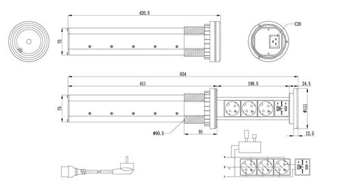 - 3 prese Schuko 15A - 250V massimo 3250W