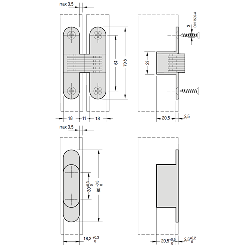 Cerniere invisibili realizzate in acciaio con snodi a lamelle.