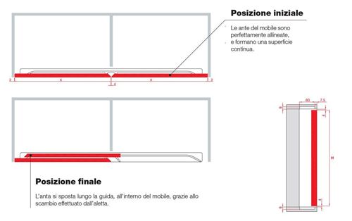 Guarnitura scorrevole per mobili con due ante complanari in luce.Altezza ante fino a 1600 mm.Portata fino a 20 kg.