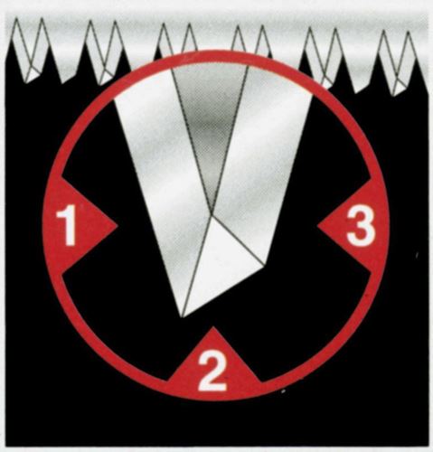 Dentatura speciale con taglio in andata e ritorno.Impugnatura ergonomica "bi-material" con inserti in gomma morbida.Manico saldato ad ultrasuoni.Affilatura Hard Point.Lunghezza lama mm. 380