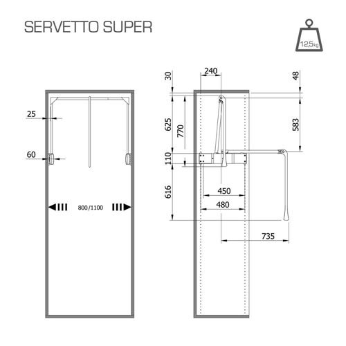 Appendiabiti saliscendi Servetto SuperTubo verniciato alluminioGusci grigiMontanti verticali verniciati alluminioManiglia in materiale plastico grigioLarghezza regolabile per vano larghezza da cm. 80 cm. 110Portata 12,5 kg.