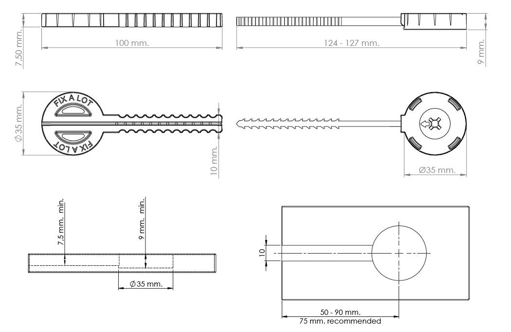 - due fori diametro mm. 35 profondità mm. 9 realizzati con centroforo a mm. 50/50 (consigliato mm. 75) dal bordo del piano