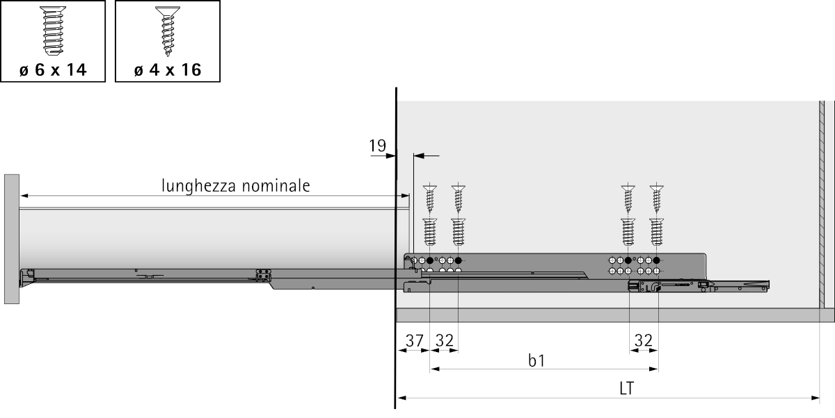 Concetto di piattaforma: stesse dimensioni del mobile, del cassetto e del frontale sia nelle guide Quadro a estrazione totale sia a estrazione semplice con montaggio a scorrimento