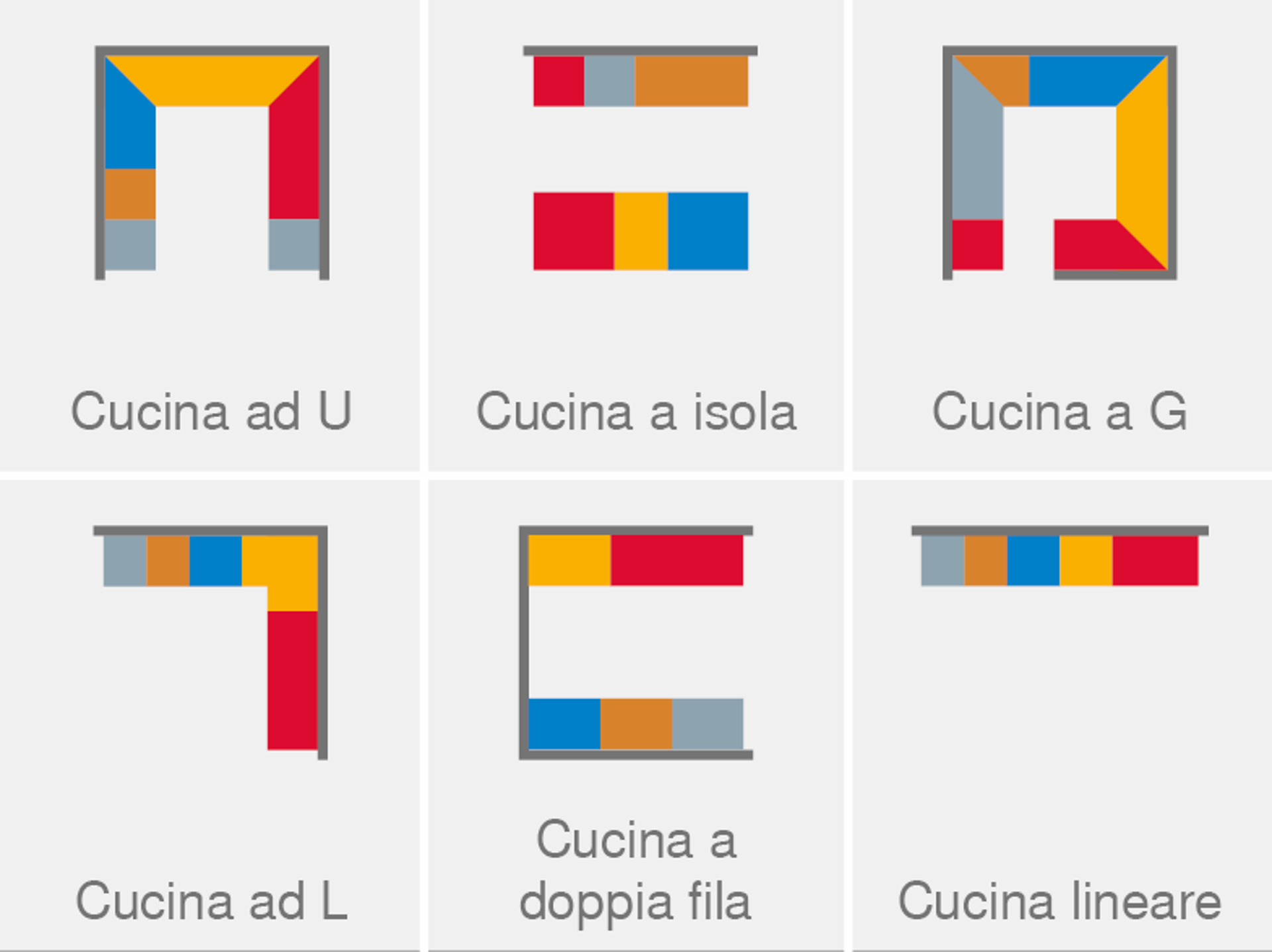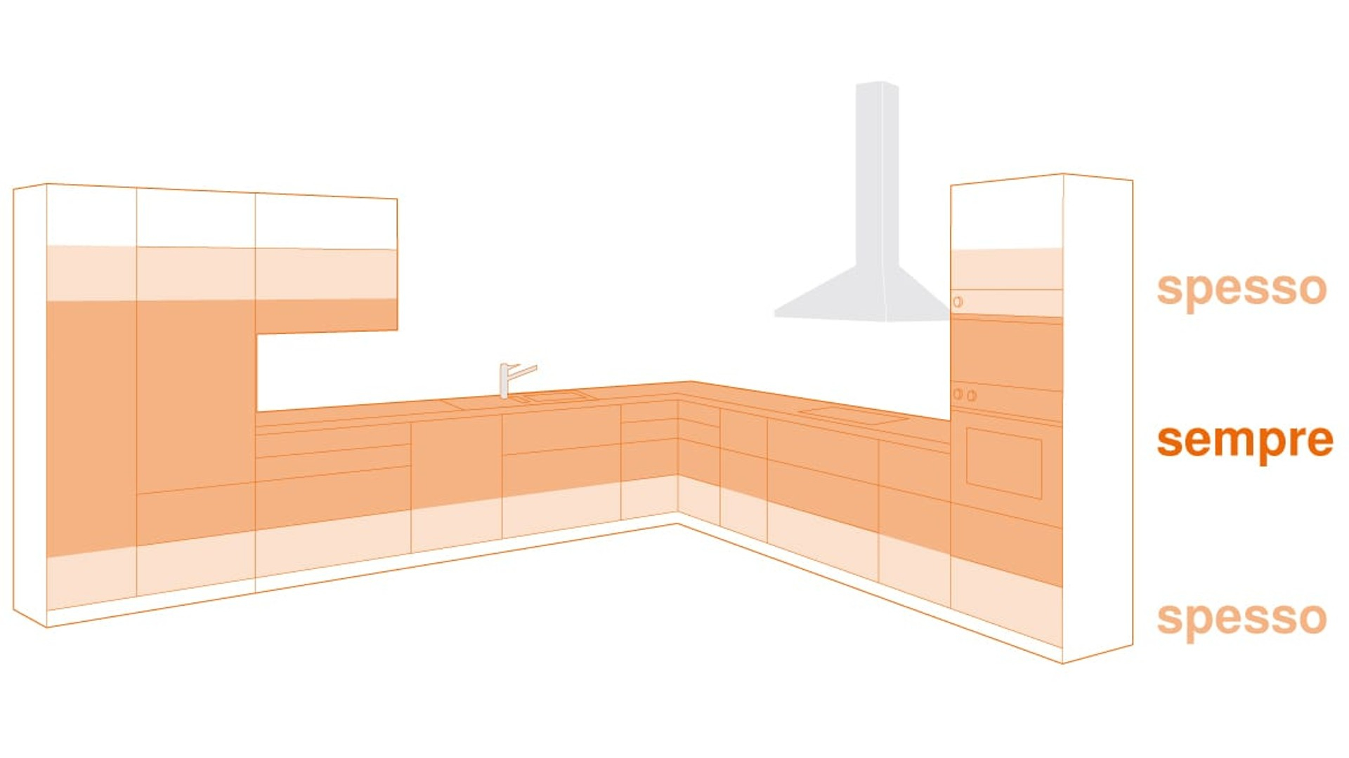 - la zona di cottura che, oltre a piano cottura e forno dovrebbe prevedere nella loro immediata prossimità anche tutti spazi necessari per ospitare pentole, padelle, coperchi, teglie ed utensili utilizzati per la cottura dei cibi