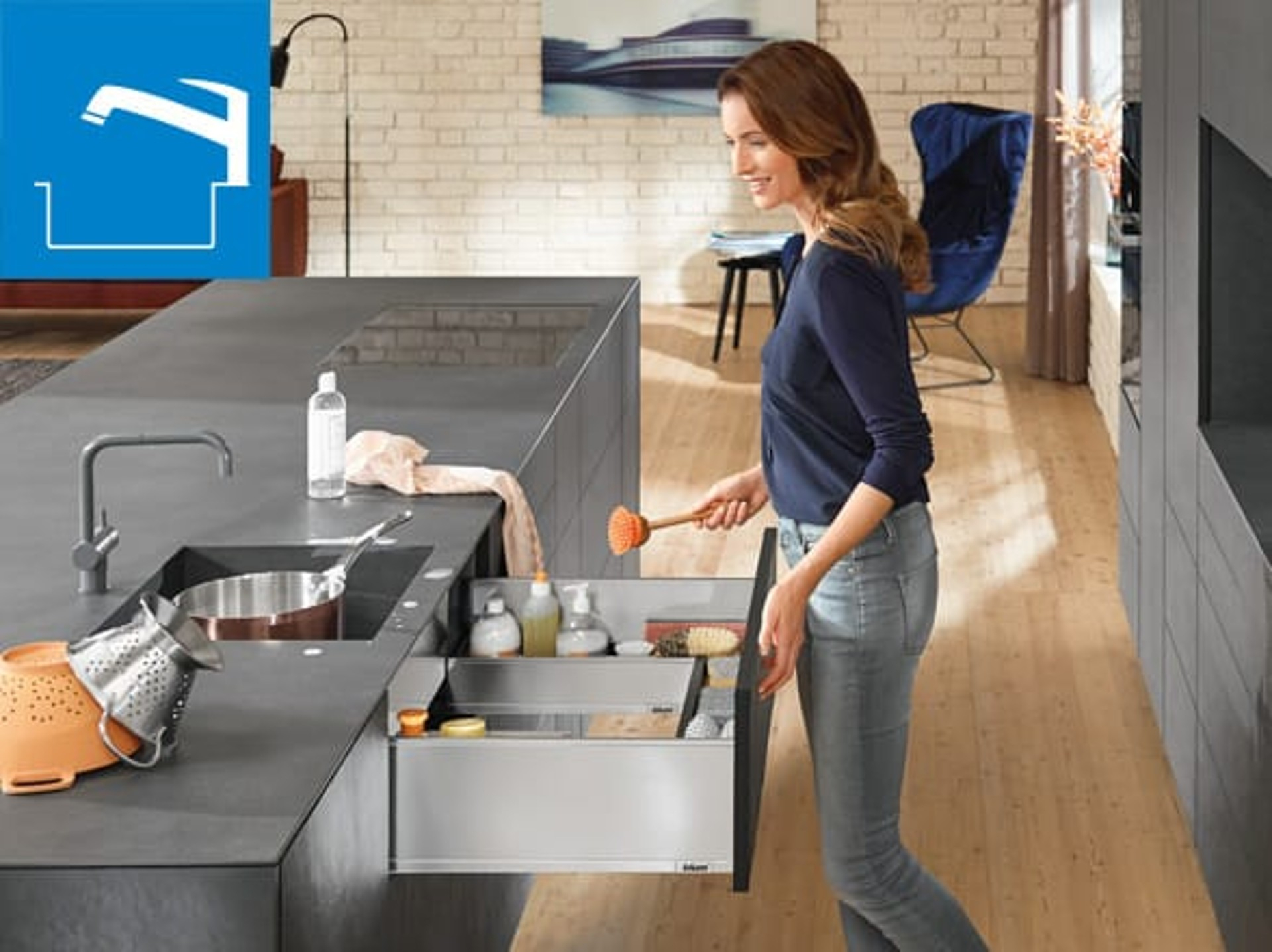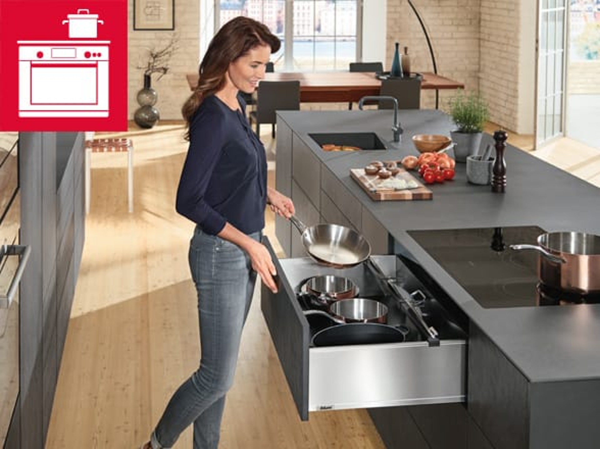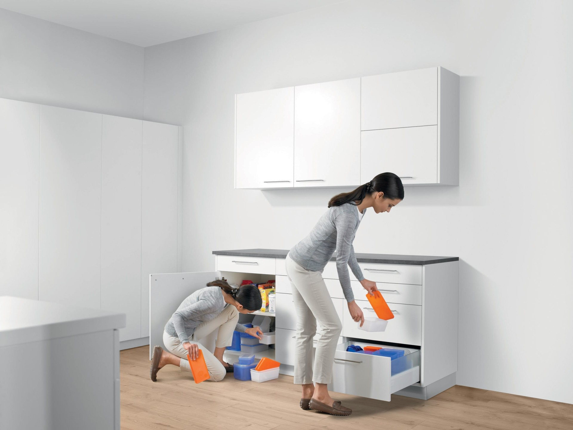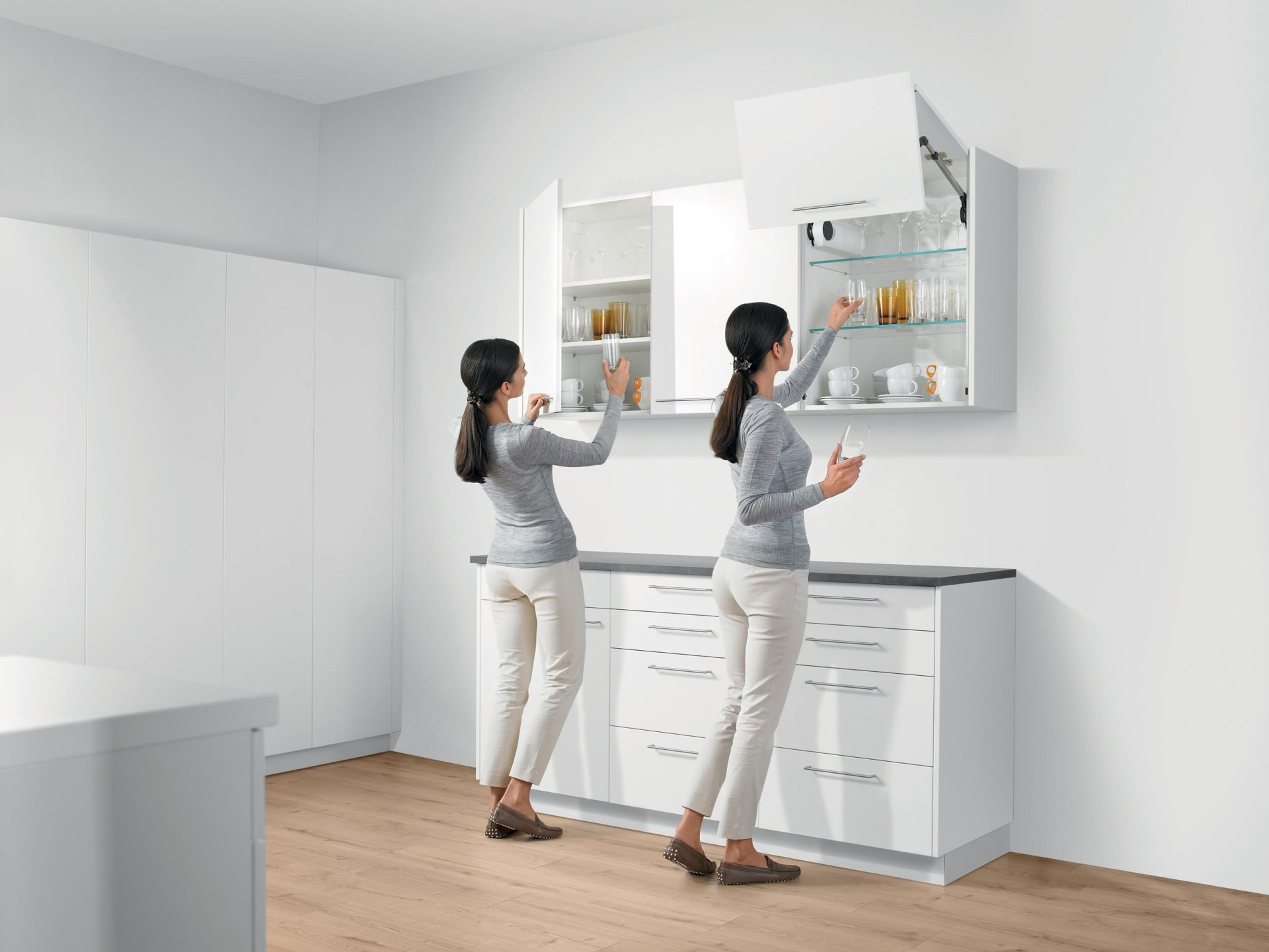 L’impiego di sistemi di apertura servoassistiti permette di gestire l’apertura dei cassette e delle ante dei pensili anche con le mani impegnate e consente alle persone di minore altezza di chiudere agevolmente le ante dei pensili anche quando la loro escursione verticale le porta molto in alto.