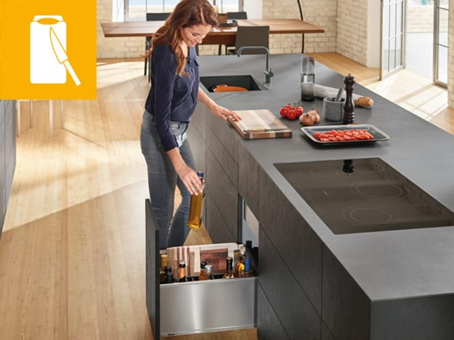 L’utilizzo di cassetti ad estrazione totale nelle basi permette di non chinarsi o inginocchiarsi e raggiungere tutto il contenuto senza dover spostare nulla
