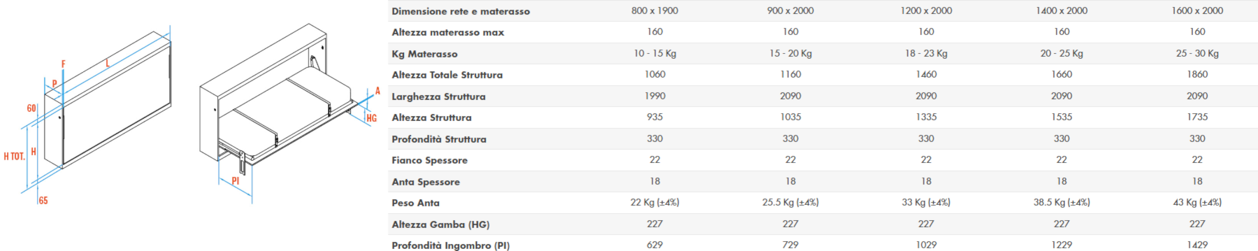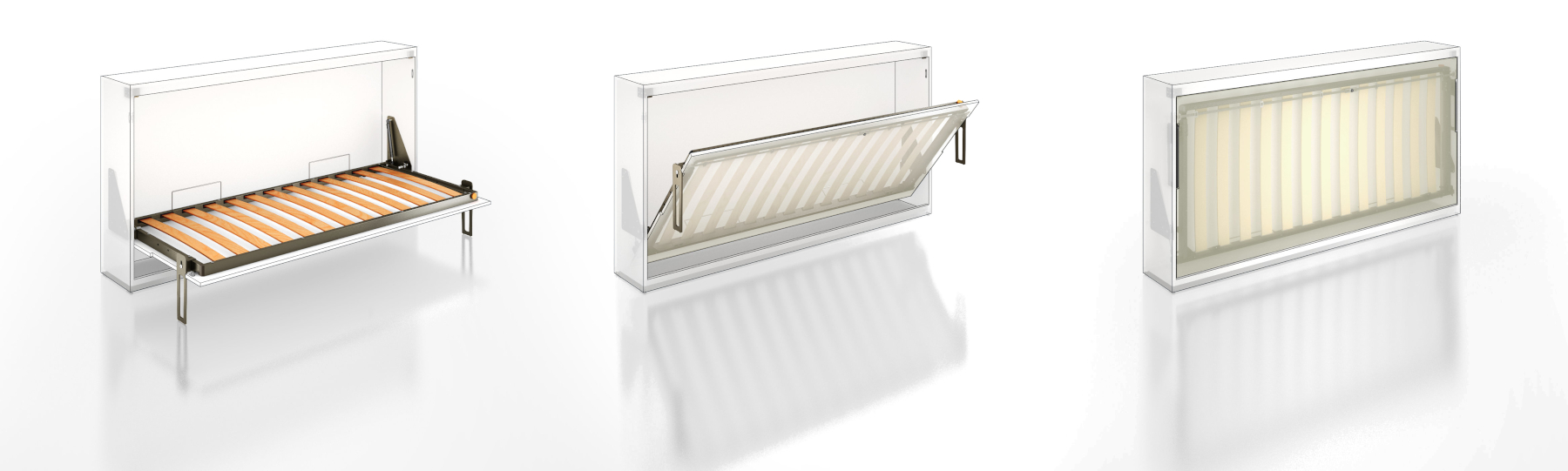 Progettato per integrarsi anche negli spazi più contenuti, questo sistema per letti singoli è compatibile con armadi dalla profondità di appena 330 mm. Il design pulito dell'anta liscia è valorizzato da fresature tecniche, studiate per alloggiare a filo la gamba a caduta, la quale termina con un robusto puntale in PVC antiurto per garantire silenziosità e protezione delle superfici. L'apertura è fluida e controllata grazie a precise molle a gas; inoltre, per le versioni da 800 e 900 mm, la sicurezza è assoluta grazie a un blocco meccanico ad inserimento automatico che impedisce la chiusura accidentale, fornito di serie.