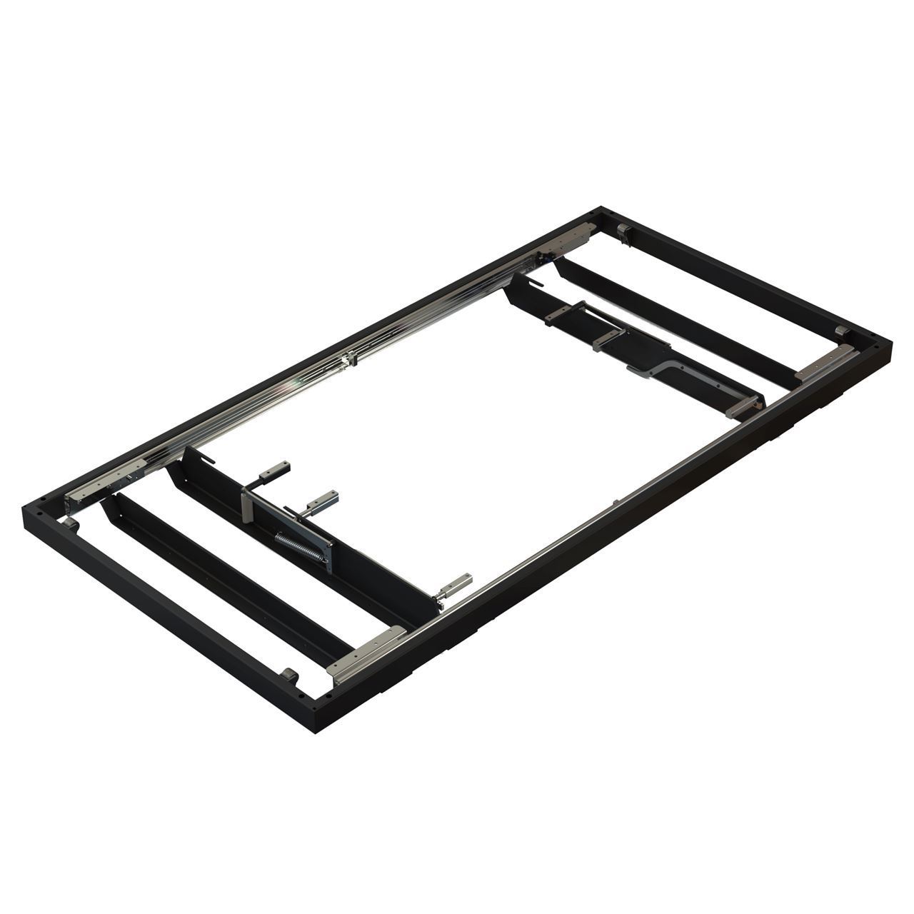 Telaio per tavolo allungabile con apertura centrale con movimento di rotazione che non esce dal piano inferiore del telaio consentendo l'utilizzo di una vasta gamma di gambe e lasciando massima libertà di progettazione e design.